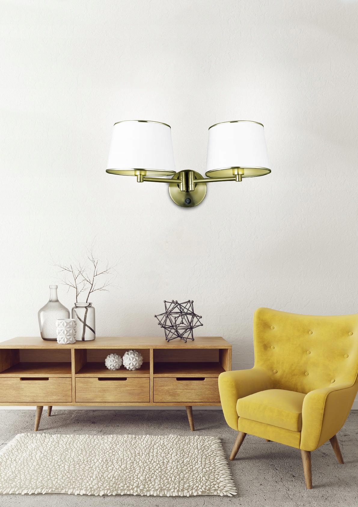 - Nie zawiera głównego źródła światła Trzonek: E14 Moc max (W): 2x40 Materiał: podstawa stalowa, abażur tkanina/PCV Kolor: patynowy
