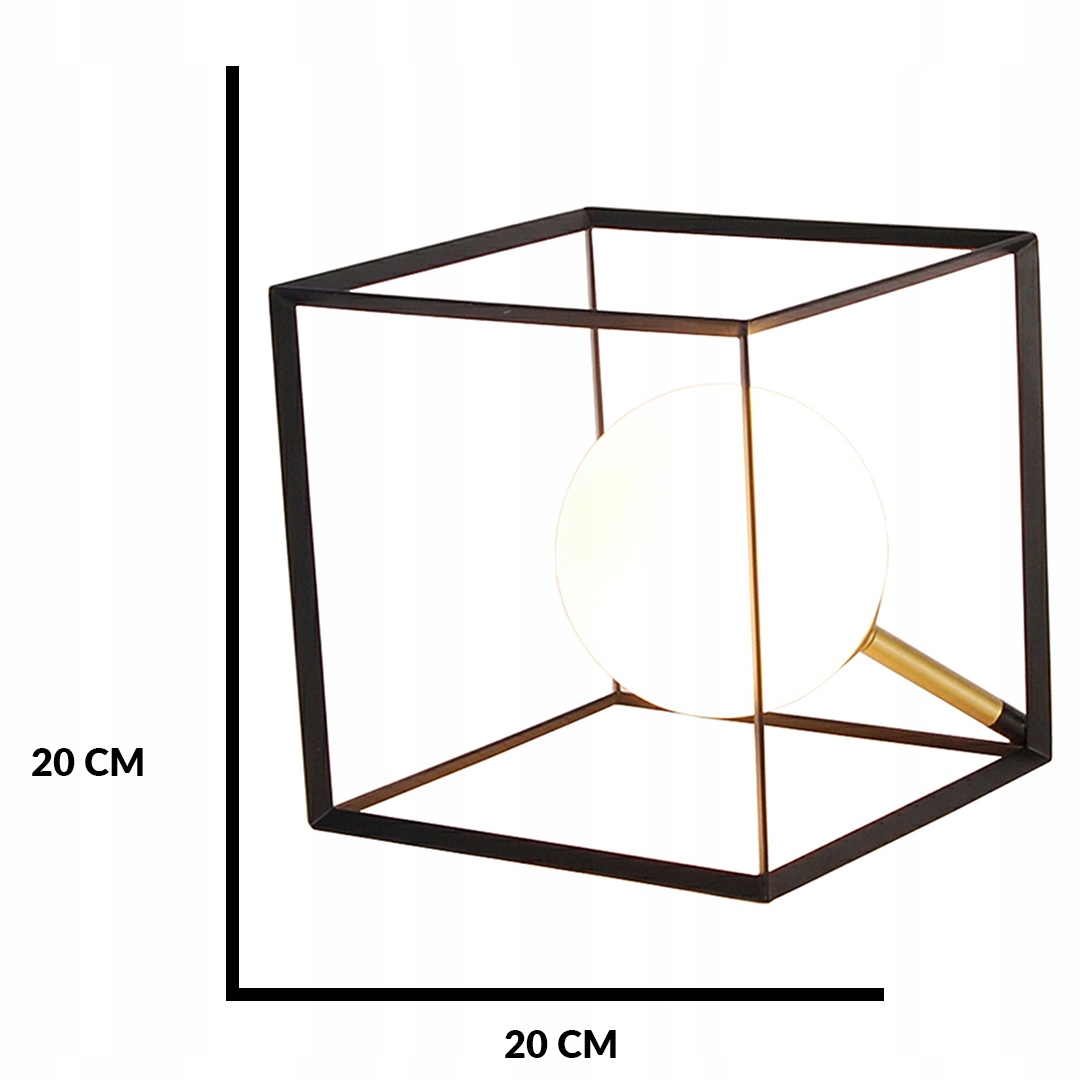 • Lampy industrialne w ksztalcie kostki, wykonanych z metalu w kolorach czarnym i złotym, z białym, szklanym kloszem wewnątrz.