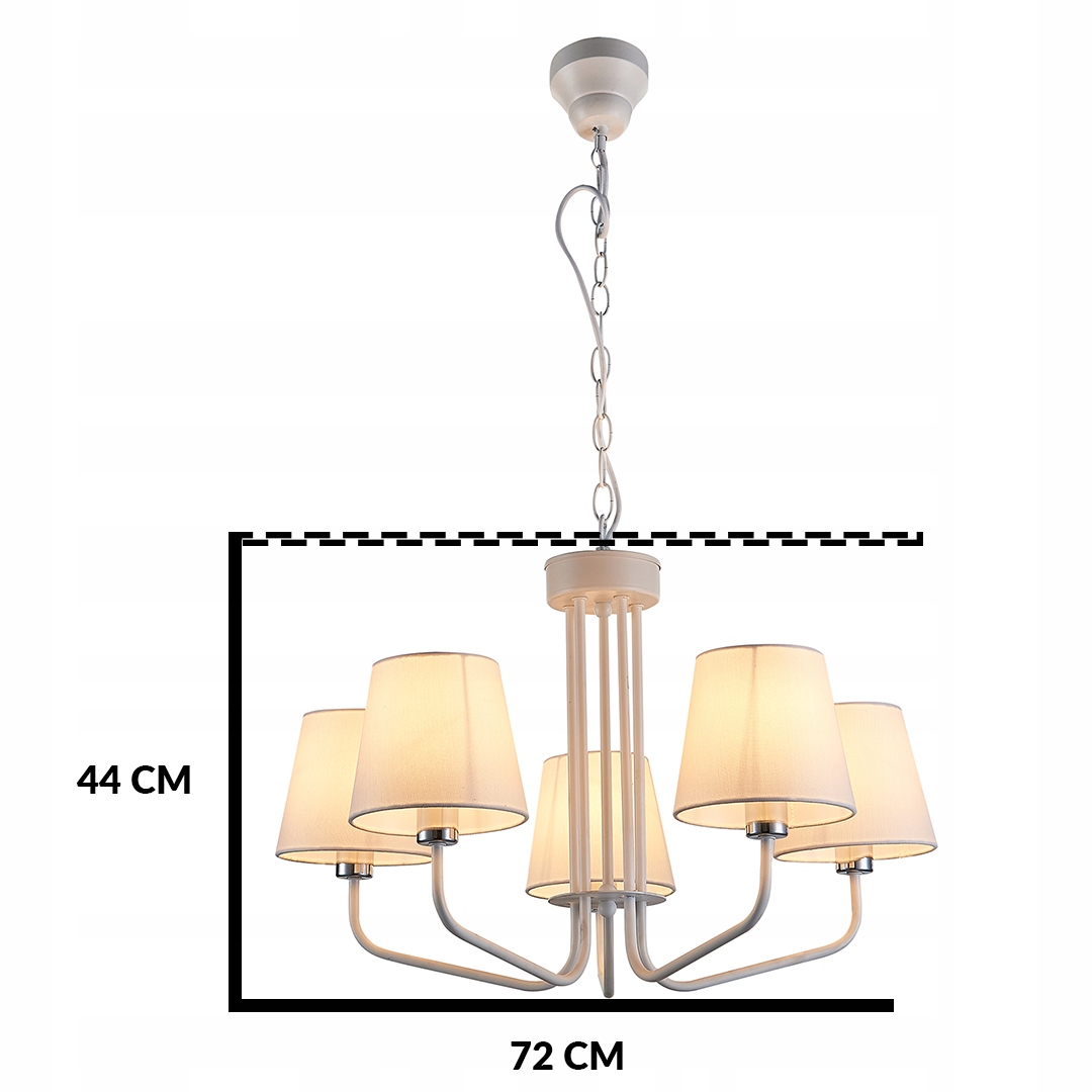 - Nie zawiera głównego źródła światła Trzonek: E14 Moc max (W): 5x60 Materiał: metal, klosz tkanina Kolor: biały