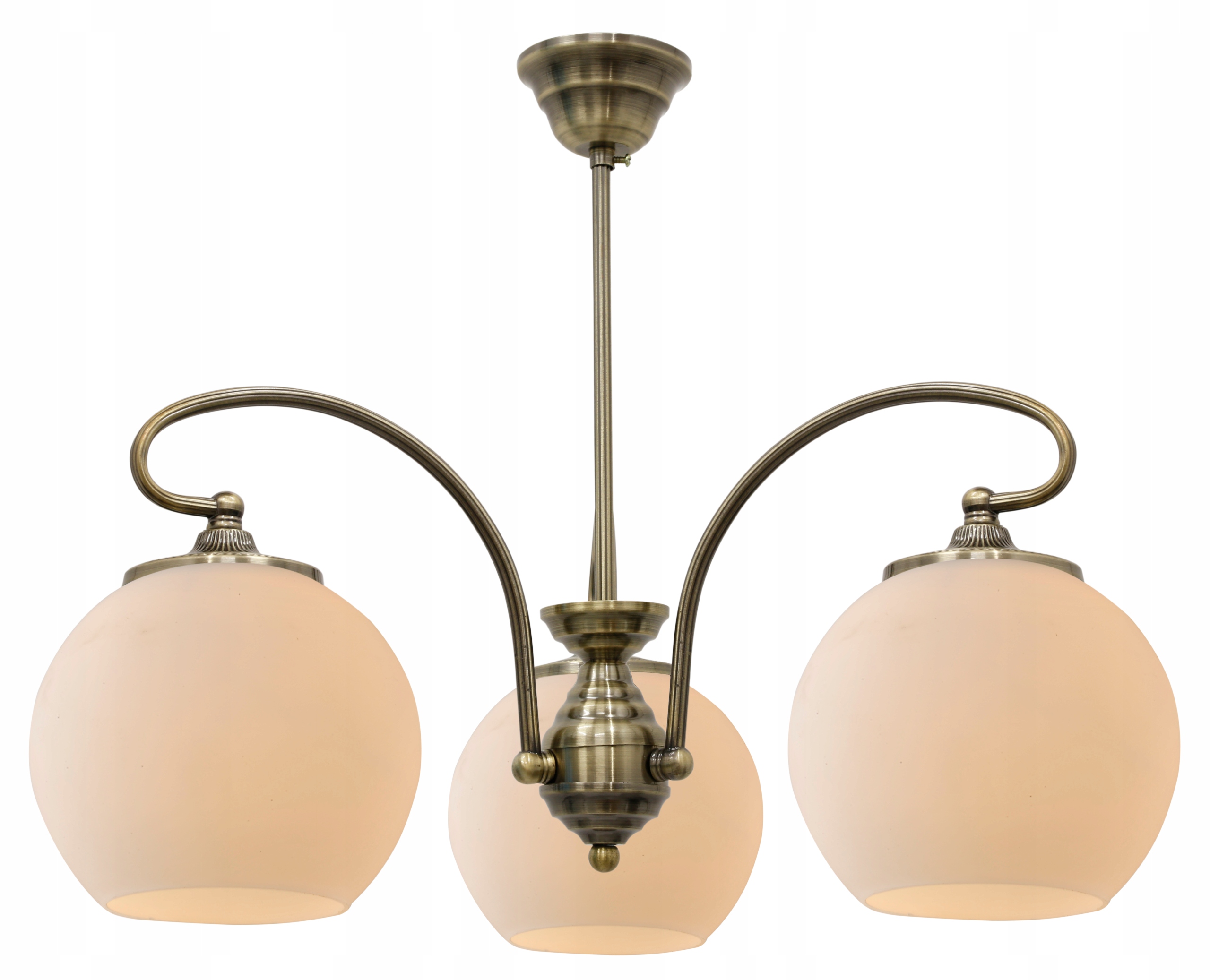 - Nie zawiera głównego źródła światła Trzonek: E27 Moc max (W): 3x60 Materiał: podstawa stalowa, klosz szklany Kolor: patynowy