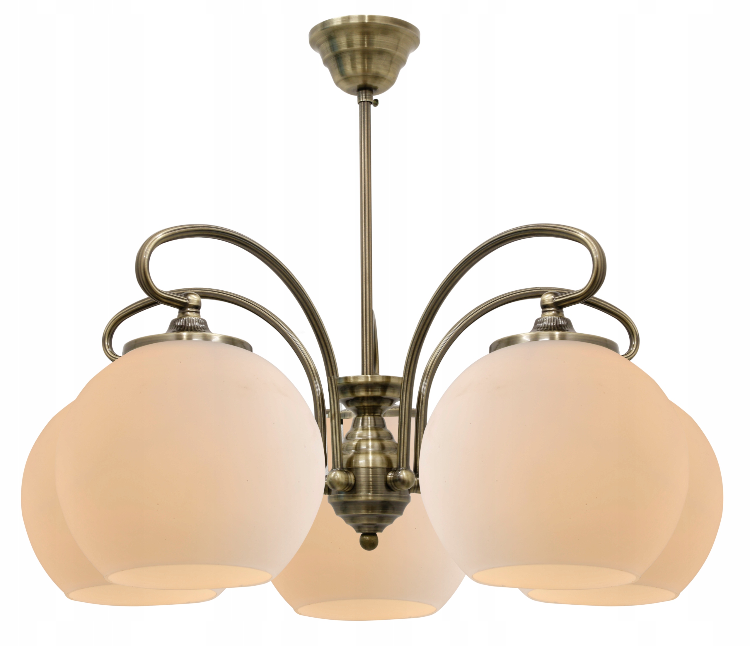 - Nie zawiera głównego źródła światła Moc max (W): 5x60 Materiał: podstawa stalowa, klosz szklany Kolor: patynowy