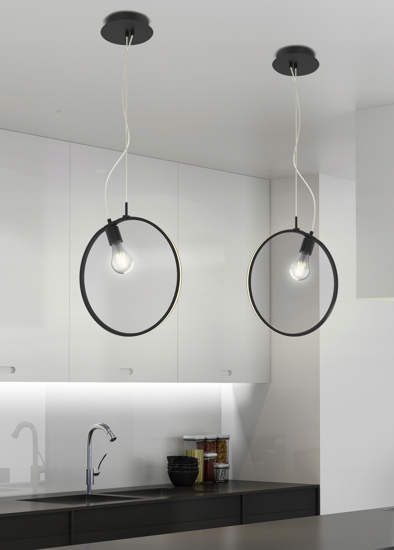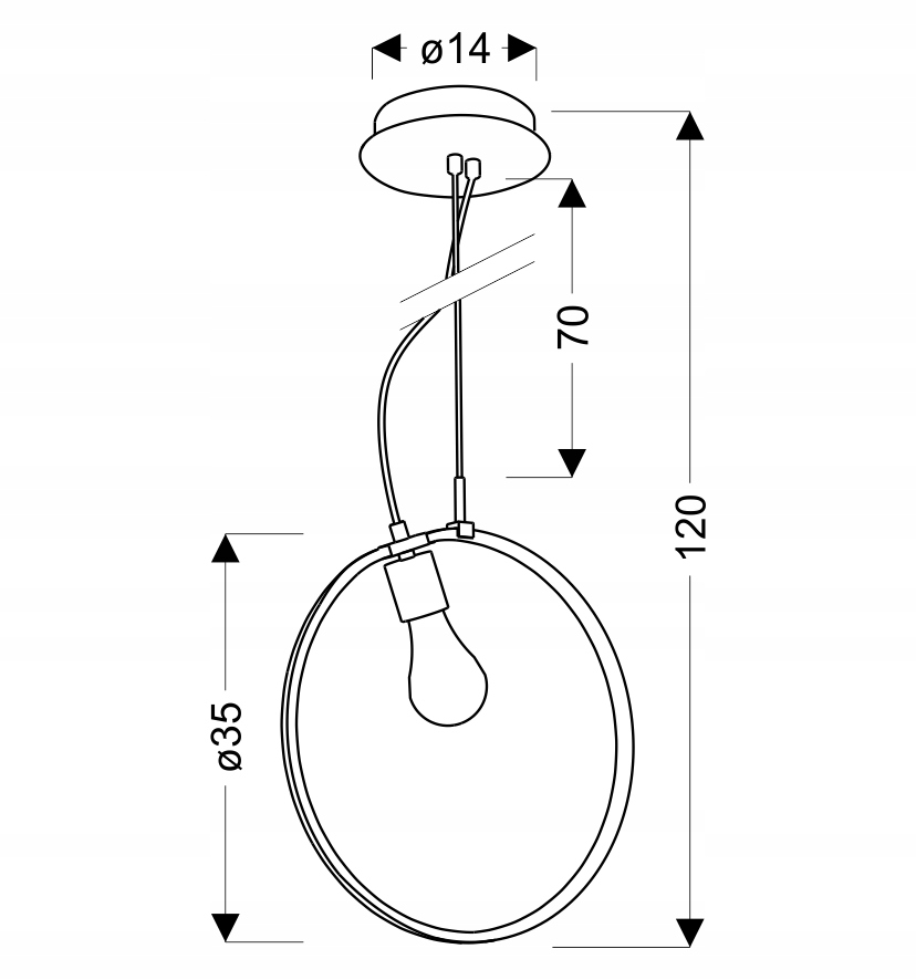 - Lampa wisząca na jednej lince o okrągłym kształcie z wewnętrzną żarówką.