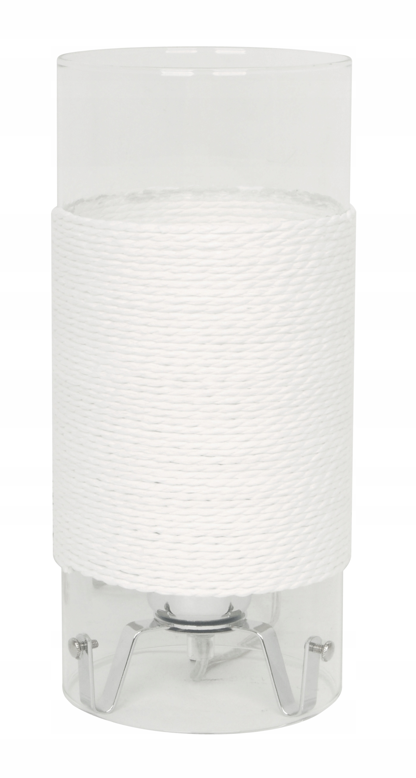 Nowoczesna metalowa podstawa ze szklanym kloszem. Klosz owinięty w części białym naturalnym materiałem. Idealna dla miłośników nowoczesnych aranżacji.
